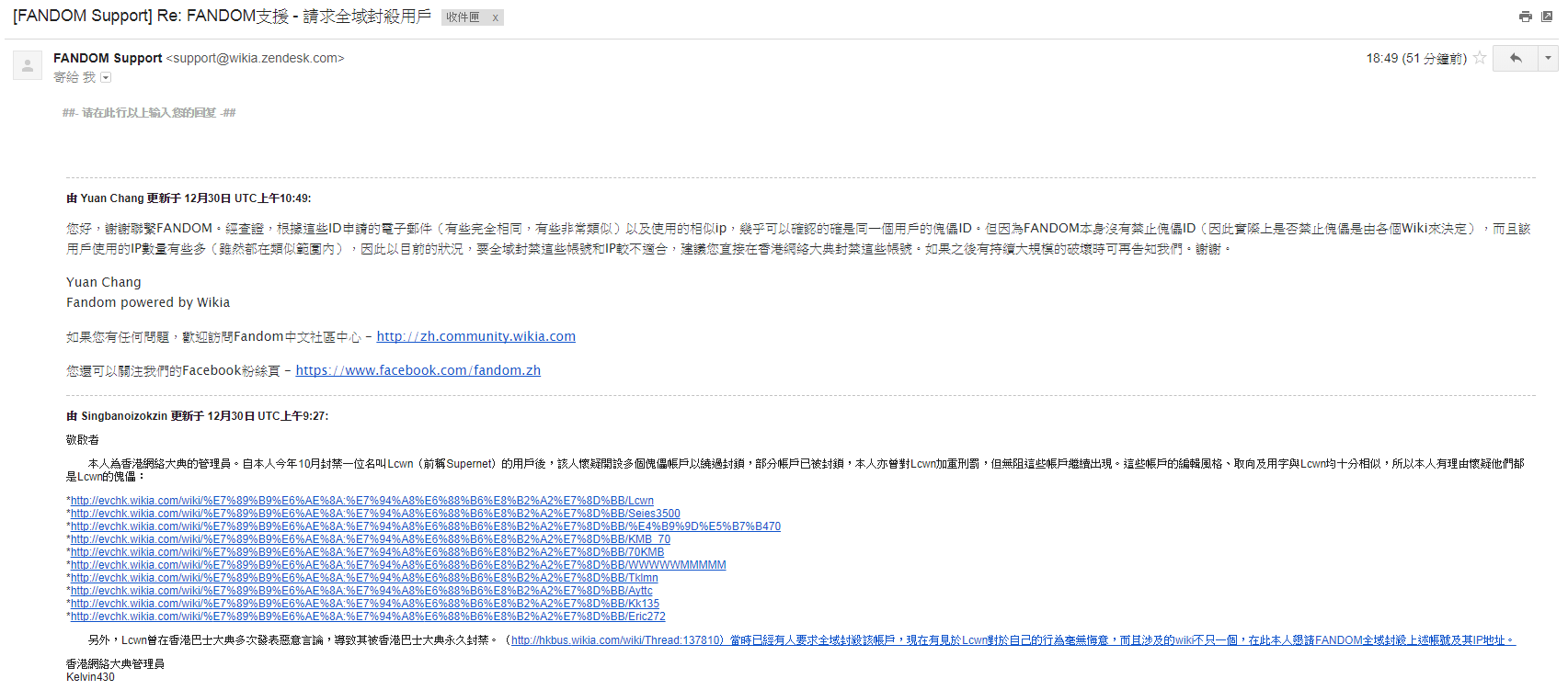 本人較早前提及就Lcwn開設分身一事向Fandom要求全域封殺Lcwn及其分身。現在本人已經獲得Fandom回信,指他們雖然不會全域封禁有關帳號,但同時指出有關帳號的IP位址和電郵地址均十分相似,這意味著Lcwn開設分身一事證據確鑿。