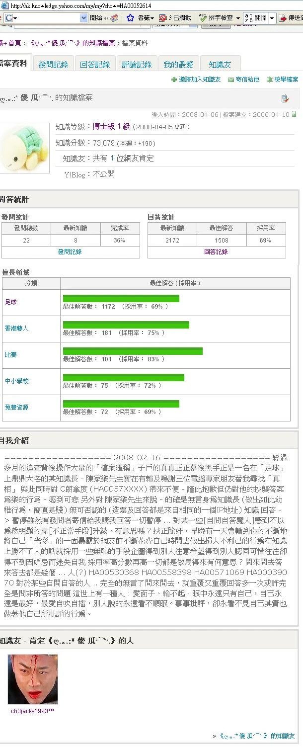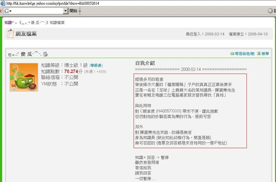從他的個人介紹中看出,ღ.。.:* 傻 瓜·´¯`·.看來已知道某知識長,或是網典寫手cklm999的真名。