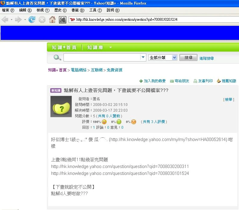 - 07年9月5日表明「離開這個是是非非的知識+」後,曾有一段時間停止回答,但按他分數增長及「最近登入」時間來看,他每日也有登入。到了十月初他又開始回答。