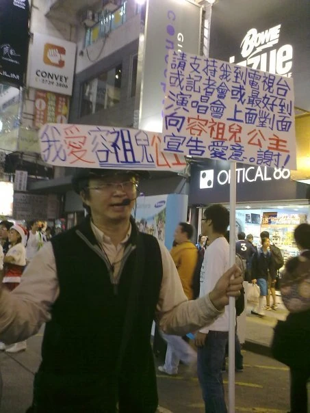 檢 • 論 • 編 容祖兒祖兒文化容祖兒花名大全 • 抄襲實錄 • 整容爭議 • 容語錄 • 改圖集貌似人物米高積遜 • 艾辛所屬經理人公司英皇娛樂集團密切人物楊受成 ( 老闆 ) • 劉浩龍 ( 男友 ) • 何韻詩 ( 斷背舊愛 )歌迷代表慈雲山鄭列瓊 • 「我愛容祖兒公主」大叔 「我愛容祖兒公主」大叔是一位出沒在旺角行人專用區的痴漢。他頭戴著「我愛容祖兒」字樣的「帽」,手持「愛的宣言」紙牌,帶著擴音器,向陌生的路人訴說對容祖兒的愛念。 他的事蹟傳遍各傳媒及討論區,網民為他在facebook開設的群組更擁有超過1,300名成員。[1] 「我愛容祖兒公主」大叔 視頻 另見 容祖兒 痴漢 註解 ↑ Facebook群組:我見過「我愛容祖兒公主」!! 「我愛容祖兒公主」大叔是一個小作品。你可以通過編輯或修訂擴充其內容。 分類: 模板呼叫時使用重複的參數的頁面 容祖兒 小作品 痴漢 除非另有註明,否則社區內容均使用CC-BY-SA授權條款。