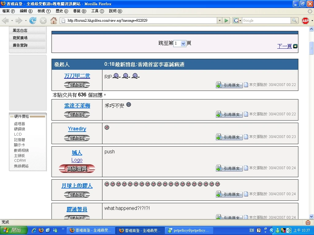2007年4月30日,高登會員万刀甲二世於4月30日凌晨發帖,聲稱香港首富李嘉誠已死[1],消息一出,震驚高登。 有關帖子截圖 儘管其後万刀甲二世表示自己知錯,要求高登人原諒[2],但假消息一出,一發不可收拾。消息迅速發佈至Yahoo!知識+、香港討論區、uwants等[3][4][5]。不少人表示不安、惶恐。有股民更揚言持有李嘉誠旗下公司長實、和黃的股票,不知應否沽售套現。 消息一出,影響廣泛。恒生指數於4月30日上午下跌了二百多點。懷疑此次港股跌市是與假消息流傳有關[6][7]。 註解 ↑ 高登討論區:0:18最新消息:香港首富李嘉誠病逝〈已刪除〉 ↑ 高登討論區:我唔敢再玩野la,請各高登會員原諒我la ↑ Yahoo知識+:我聽d人講話李生病逝喎...我好唔好即時放晒手頭上d長實呀? ↑ [1] ↑ [2] ↑ 高登討論區:股市真係大瀉, 三人成虎 ↑ 高登討論區:市場流傳李嘉誠逝世,恆指大幅下跌 分類: 高登大事 網絡謠言 2007年 除非另有註明,否則社區內容均使用CC-BY-SA授權條款。