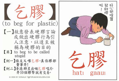 乞膠(高登潮語學習字卡) 乞膠指膠人以假膠行為博人俾膠,通常版友會以乞膠圖回應,此圖亦有大量不同版本,詳見乞膠圖。 其他改圖 101次乞膠(cheung1303製作)在圖片冊中增加圖片 相關條目 乞膠圖 檢 • 論 • 編 膠系術語名詞類膠/硬膠 • 膠人 • 膠文 • 膠力 • 膠幣 • 膠問 • 膠答 • 膠論 • 膠劇/膠節目 • 膠電影 • 膠詞 • 膠歌 • 膠譯名 • 膠清製作 • 膠羊動詞及形容詞類膠/硬膠 • 膠化 • 乞膠 • 自膠 • 派膠/俾膠 • 爆膠 • 膠up/膠談 • 發膠 • 膠都費事俾 • 反膠(行為)膠人類(列表)真心膠/真心腸/真必腸/直必腸 • 假膠/假腸/蝦膠/蝦腸 • 反膠(人士)膠星 • 煩膠 • 窮膠 • 癲膠 • 蠢膠 • 惡意膠 • 黑心膠 • 偽化膠 • 巴膠(巴士)• 𨋢膠(升降機)• 鐵膠 • 知膠(Yahoo!知識+)• 共膠 • 民膠 • 左膠 • 大中華膠 • 膠議員 • 倭膠/崇日膠(日本)• 道德膠 • 耶膠(基督教) • 腳膠其他小丑神(膠圖像代表) • 你加侖夠未(膠句子粗口) • 乞膠圖網絡歌曲膠歌 • 膠朋友 這是與高登相關的小作品。你可以編輯或修訂擴充其內容。 分類: 模板呼叫時使用重複的參數的頁面 高登小作品 高登術語 除非另有註明,否則社區內容均使用CC-BY-SA授權條款。