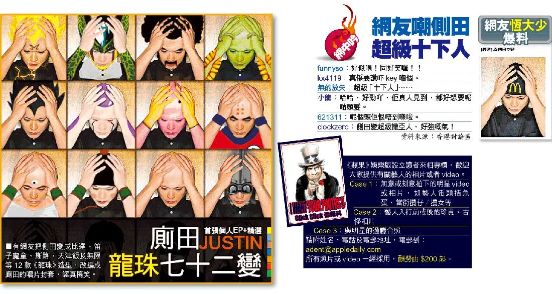 側田自從被《便利》偷影後,其「M字額」髮型經常成為網民笑柄,在高登,「廁田」成為了側田的錯字系別稱,更有人認為「廁田」屬最惡毒的謾罵,並非純粹錯字[2];tv谷之對應錯別字為偷田。而在一個名為「[科學問題] 側田用乜野痴住頂帽?」的帖子中 [3],高登網民把側田改造成日本漫畫《龍珠》中多位主角,包括M字額的比達和光頭的無限,更製作「廁田龍珠七十二變廣告」。改圖事件及後成功上報,但《蘋果日報》的凌零發竟聲稱2000fun是改圖的來源[4]。