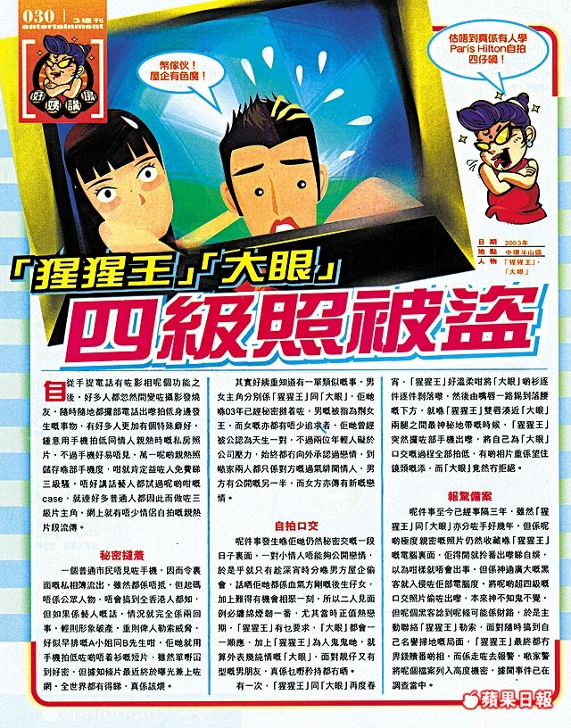 - 香港蘋果日報:警搜獲千張藝人淫照 拘4男2女 元凶隨時落網,2008年2月3日