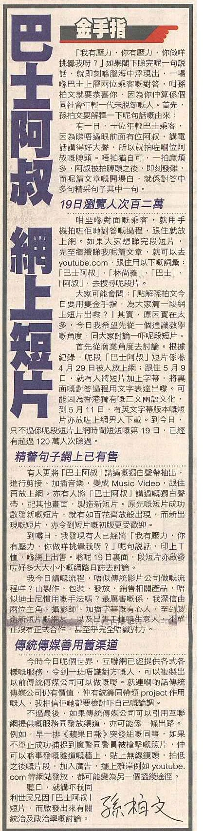 咁坐對面乘客,就用手機拍佢對答過程,跟住就放上網。如果大家想睇完段短片,先至繼續睇我呢篇文章,就可以去youtube.com,跟住用以下詞彙:「巴士阿叔」、「林尚義」、「巴士」、「阿叔」,去搜尋呢段片。 大家可能會問:「點解孫柏文今日要用隻金手指,為大家篤一段網上短片出?」其實,原因實在太多,今日我希望先從一個通識學角度,同大家討論一呢段短片。 首先從商業角度去討論。根據紀錄,呢段「巴士阿叔」短片係4月29日被人放上網;跟住5月9日,就有人將短片加上字幕,將面對答過程用文字表達出。可能因為香港獨有三文兩語文化,到5月11日,有英文字幕版本短片亦放上網畀人下載。到今日,只不過係呢段短片上網時間短短第19日,已經有超過120萬人次睇過。