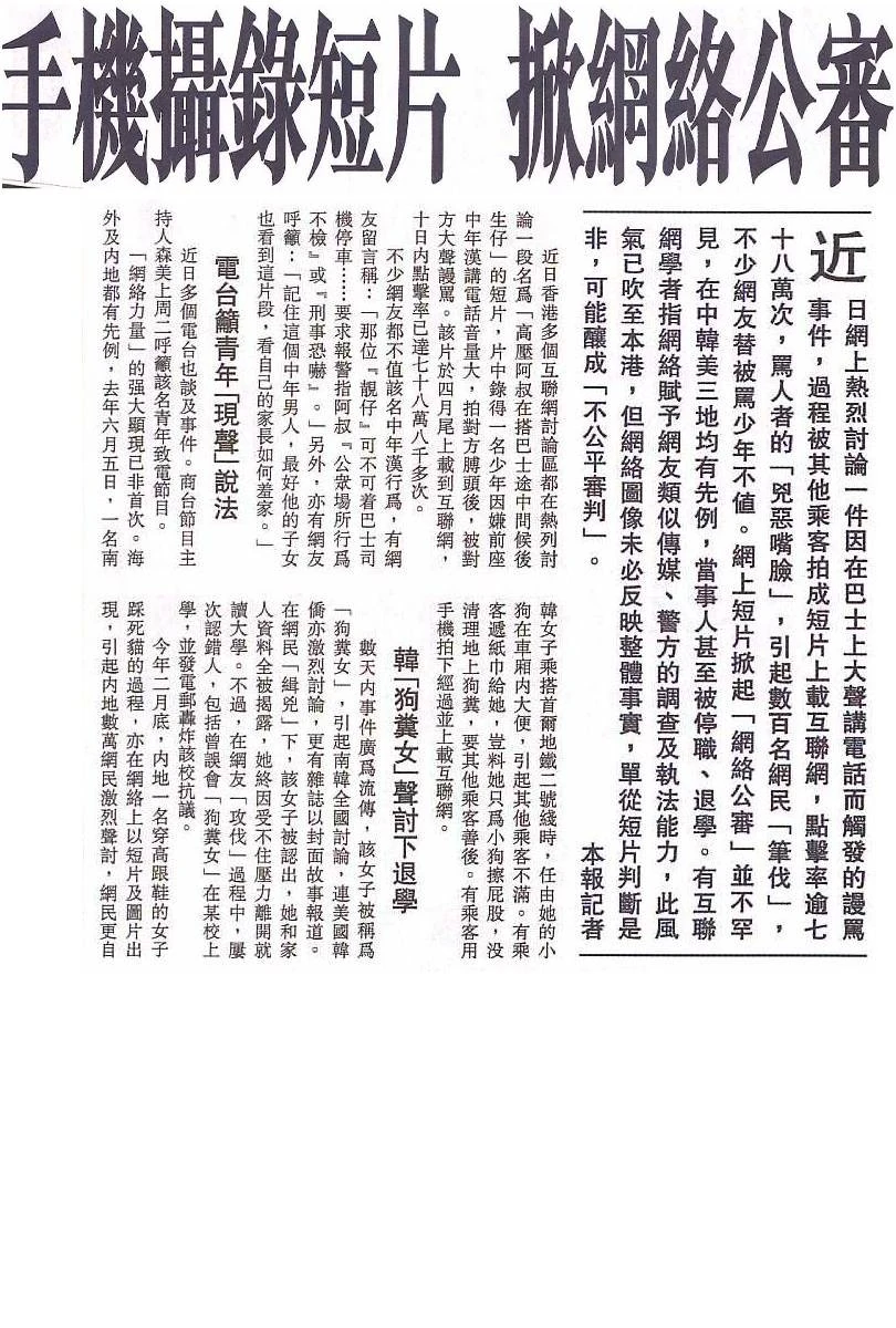 近日網上熱烈討論一件因在巴士上大聲講電話而觸發的謾罵事件,過程被其他乘客拍成短片上載互聯網,點擊率逾七十八萬次,罵人者的「兇惡嘴臉」,引起數百名網民「筆伐」,不少網友替被罵少年不值。網上短片掀起「網絡公審」並不罕見,在中韓美三地均有先例,當事人甚至被停職、退學。有互聯網學者指網絡賦予網友類似傳媒、警方的調查及執法能力,此風氣已吹至本港,但網絡圖像未必反映整體事實,單從短片判斷是非,可能釀成「不公平審判」。本報記者