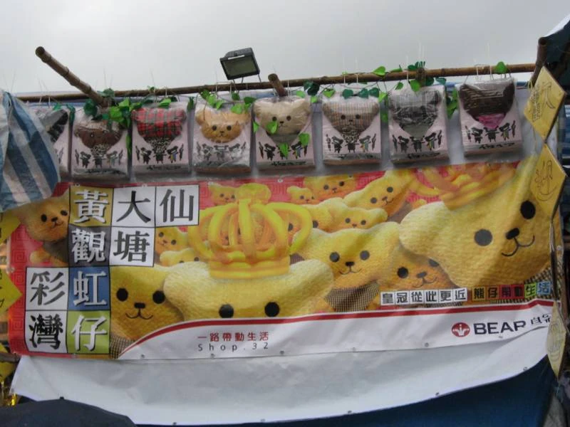 花墟年宵市場的改編港鐵海報式招牌:「黃觀虹仔」(「皇冠熊仔」)。