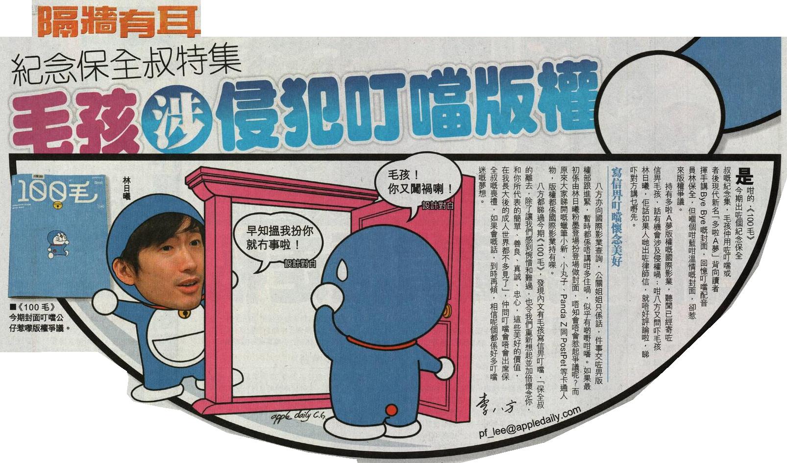 —隔牆有耳:紀念保全叔特集 毛孩涉侵犯叮噹版權,2015年1月10日,《蘋果日報》 | ||