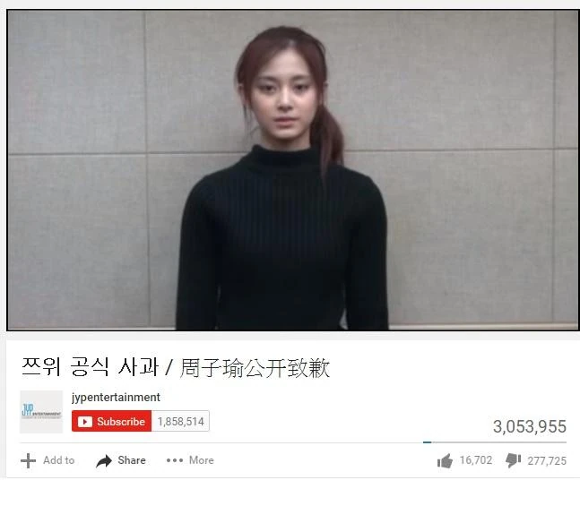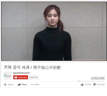 - ↑ 蘋果日報即時新聞:【韓流】子瑜「被道歉」 JYP股價一日勁跌5千萬,2016年1月16日