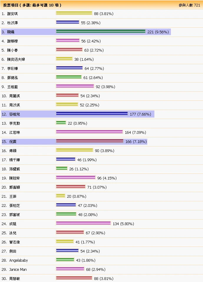 - ↑ Uwants票投討厭藝人,容祖兒排第二(圖)