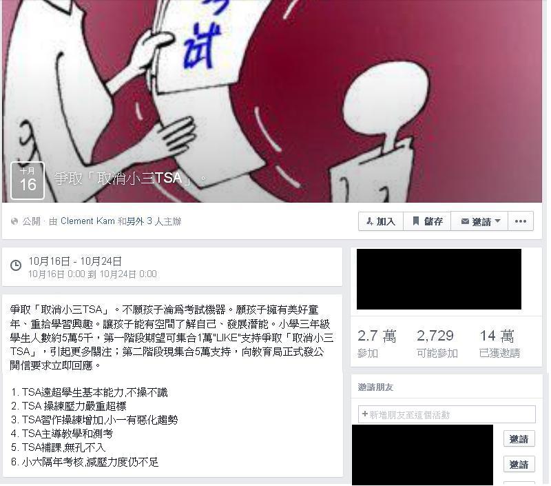 - ↑ 明報即時新聞 fb專頁:【已獲2.2萬人支持!】發起人質疑,若教局不知道坊間學校因應付TSA,而要求學生操練,是局方失職。,2015年10月18日