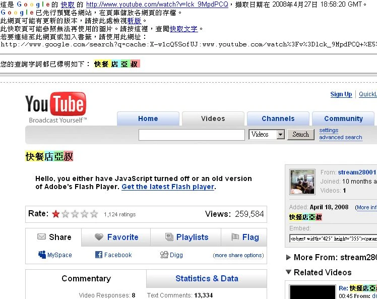 原上載者約於2008年4月28日23:50刪除該短片,並約於2008年4月29日凌晨1時在Youtube Profile中隱藏了33歲的年齡。但已有Youtube用戶將之備份並重新上載,更有用戶發放中英文字幕版。