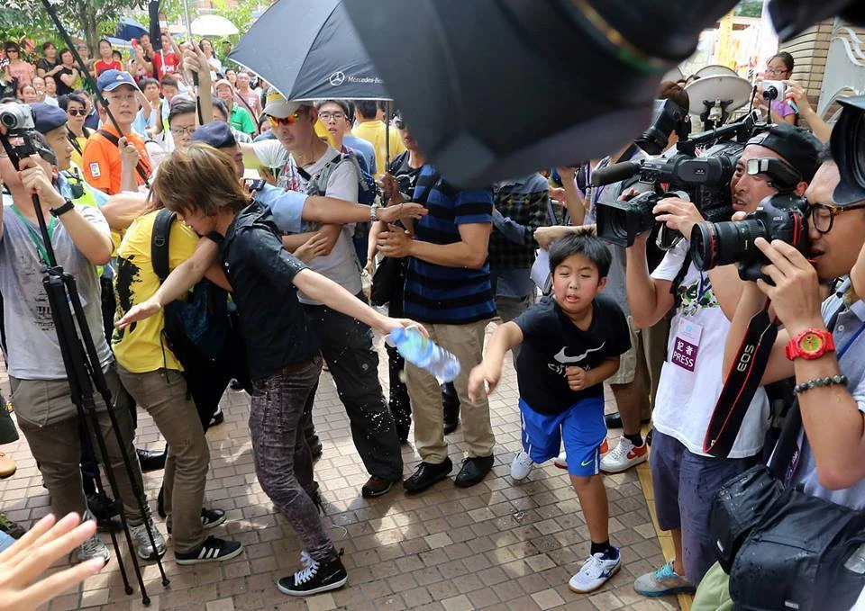 2013年8月11日,梁振英到天水圍落區參與社區論壇,場外聚集支持和反對政府的示威人士,雖由警方分隔,但仍不時對罵甚至互相推擁。其中一名小孩接受傳媒採訪時在鏡頭前申訴,指自己只說出支持梁振英,就被人打了一拳。但其他片段卻拍到他向其他示威者投擲水樽,更有聲稱是在場的攝影記者在facebook上指,小孩向其他示威人士爆粗「屌你老母閪」。
