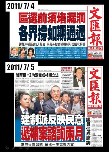 2011年7月5號,梁國雄facebook擺出一張7月4日及5日的A1頭版[2],前者是說各界撐替補機制,後者則說向公眾諮詢替補機制兩個月。當晚雷霆881節目《光明頂》也有談及,但沒有特別指明是文匯報。