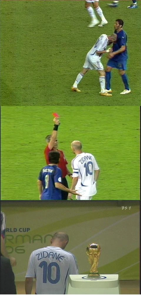 在加時下半場5分鐘,施丹涉嫌受到馬特拉斯的言語挑釁,沉不住氣向對方施以「鐵頭功」報復,轉身彎腰狠狠一頭撞中馬特拉斯胸口,馬特拉斯應聲倒地,施丹被逐出場,最後法國在互射12碼後,以總數4比5輸給意大利,但施丹在決賽前舉行的投票中獲得金球獎(決賽周最佳球員)。