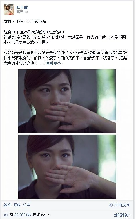 - ↑ 杜小喬的facebook:其實, 我患上了紅斑狼瘡。說真的 我並不像鏡頭前般那麼愛笑...,2014年12月21日