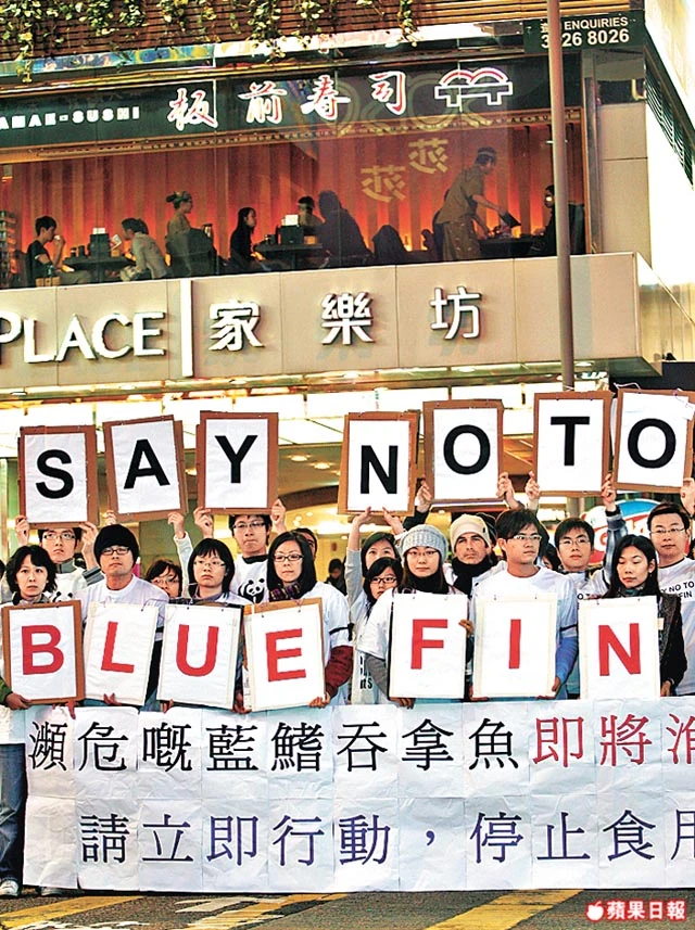 世界自然基金會代表到板前壽司旺角分店外請願,呼籲市民拒絕進食瀕危的藍鰭拿魚。