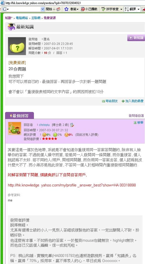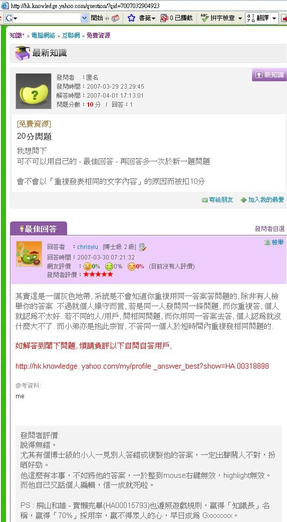 此人早於06年4月,便已經不斷在屈本人知識+抄襲此人之回答,但沒有證據。 其後在07年7月起: