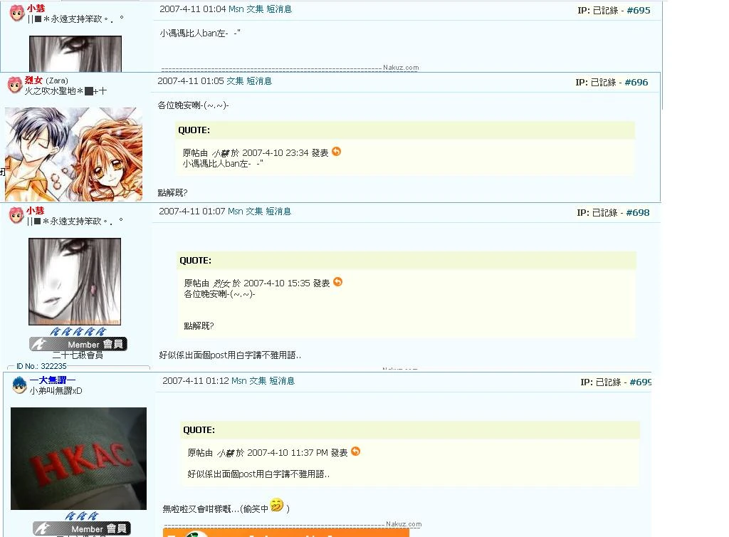 另外,Nakuz管理層又與吹水交友區的會員私下結黨,更為吹水交友區內的會員(小慧)打壓所有駁回她回覆的人。
