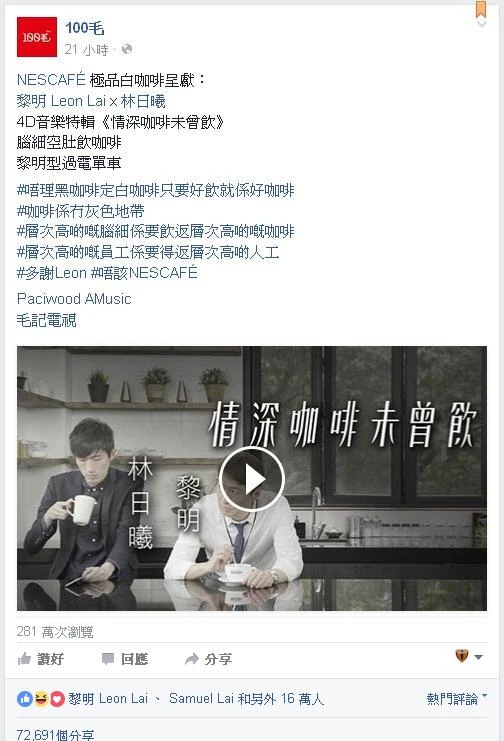 編輯 因演唱會再爆紅的黎明罕有接拍廣告,並與「腦細」林日曦合作,網上反應空前熱烈 5月下旬 黎明與林日曦及劉江合作拍攝的咖啡廣告在《100毛》及多個平台播出,網上反應空前熱烈。 城市大學陳大河綜合會堂頂部一幅巨型天花突然坍塌,三人受傷送院,意外備受關注。 全國人大委員長張德江抵港視察,言行備受關注,當中警方保安安排被指擾民。 5月20日 傳媒報道無綫電視未能就歌曲網上平台版權問題與環球音樂達成協議,環球要求旗下歌手歌曲全數從myTV等網上頻道下架。 5月18日 全國人大委員長張德江續於香港視察,下午參觀科學園時車隊逆線而行,網民怒轟漠視香港法律。 5月17日 社民連黃浩銘乘張德江訪港,早上於獅子山附近的筆架山山腰掛起「我要真普選」直幡,網民熱議其舉動。 5月16日 立法會宣布新採訪指引,下屆起將不區分媒體性質,即不論網媒、紙媒或電子傳媒,只要從事新聞報道業務及有原創報道,便可獲發記者通行證。 消委會測試六款運動應用程式所要求的權限,發現可能會泄露手機內的敏感資料,更有應用程式會把資料傳送給第三方或廣告公司。 檢 • 論 • 編 香港網絡大事表總表新聞動態 • 香港網絡動態列表高登大事表00年代2000 • 2001 • 2002 • 2003 • 2004 • 2005 • 2006 • 2007 • 2008 • 200910年代2010 • 2011 • 2012 • 2013 • 2014 • 2015 • 2016 • 2017 • 2018 • 201920年代2020 • 2021膠登大事表舊膠登時代2006 • 2007 • 2008 • 2009 • 2010新膠登時代2013 • 2014 • 2015 • 2016 • 2017 • 2018郊登年代2019 • 2020LIHKG大事表10年代2016 • 2017 • 2018 • 201920年代2020 • 2021網誌界大事表00年代2003 • 2004 • 2005 • 2006 • 2007 • 2008 • 200910年代2010 • 2011 • 2012 • 2013 • 2014 • 2015 • 2016 • 2017 • 2018Facebook大事表2008或以前 • 2009 • 2010 • 2011 • 2012 • 2013 • 2014 • 2015 • 2016 • 2017 • 2018 • 2019Yahoo!知識+大事表2006 • 2007 • 2008 • 2009 • 2010 • 2011 • 2012 • 2013及以後 分類:模板呼叫時使用重複的參數的頁面大事表 除非另有註明,否則社區內容均使用CC-BY-SA授權條款。