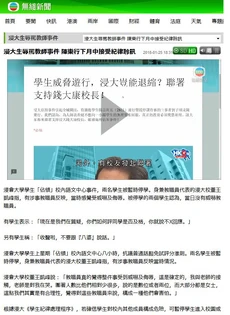 編輯 無綫新聞報道有浸大校友聯署支持校長錢大學暫停抗議普通話考核要求學生學籍,被指疑報「假新聞」 1月下旬 浸會大學有學生抗議普通話考核要求「佔領」該校語言中心,兩名學生因而遭暫停學籍,引起外界關注。 被控偷取印花的前萬寧七旬清潔工,官稱其行為非常可疑,惟有疑點下獲判無罪。 1月27日 代表香港眾志出選港島區立法會補選的周庭被選舉主任裁定提名無效,網民熱議。 1月25日 港鐵為廣深港高鐵舉辦命名大賽,引起不少網民發揮創意提出各種命名建議。 1月22日 前本土民主前線發言人梁天琦因2016年旺角「魚蛋革命」被控暴動、煽動暴動及襲警罪,是日應訊承認一項襲警罪但否認另外三條控罪,被法庭撤銷擔保並即時還押。 檢 • 論 • 編 香港網絡大事表總表新聞動態 • 香港網絡動態列表高登大事表00年代2000 • 2001 • 2002 • 2003 • 2004 • 2005 • 2006 • 2007 • 2008 • 200910年代2010 • 2011 • 2012 • 2013 • 2014 • 2015 • 2016 • 2017 • 2018 • 201920年代2020 • 2021膠登大事表舊膠登時代2006 • 2007 • 2008 • 2009 • 2010新膠登時代2013 • 2014 • 2015 • 2016 • 2017 • 2018郊登年代2019 • 2020LIHKG大事表10年代2016 • 2017 • 2018 • 201920年代2020 • 2021網誌界大事表00年代2003 • 2004 • 2005 • 2006 • 2007 • 2008 • 200910年代2010 • 2011 • 2012 • 2013 • 2014 • 2015 • 2016 • 2017 • 2018Facebook大事表2008或以前 • 2009 • 2010 • 2011 • 2012 • 2013 • 2014 • 2015 • 2016 • 2017 • 2018 • 2019Yahoo!知識+大事表2006 • 2007 • 2008 • 2009 • 2010 • 2011 • 2012 • 2013及以後 分類:模板呼叫時使用重複的參數的頁面大事表 除非另有註明,否則社區內容均使用CC-BY-SA授權條款。