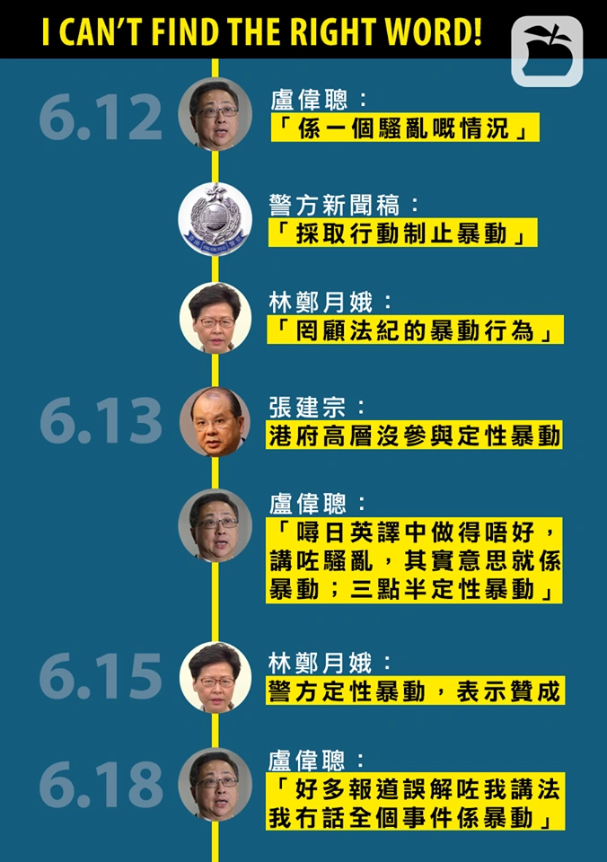 政府對6月12日示威是否「暴動」連日來有多種說法 6月中旬 行政長官林鄭月娥暫緩《逃犯條例》修訂,惟無阻約200萬人參與6月16日的大遊行,打破香港遊行示威的紀錄,迫使林鄭月娥向港人致歉,惟對外界訴求皆無回應。 一男子於金鐘太古廣場掛起橫額抗議《逃犯條例》修訂,危坐天台後消防拯救不果墮樓重創,送院後證實死亡,網民致哀。 6月12日 《逃犯條例》修訂原訂是日於立法會恢復二讀,惟聲援示威人士早上成功佔領金鐘一帶路面,雙方多番衝突後警方終在下午以大量發射催淚彈、橡膠子彈及布袋彈清場,多人受傷,網民全日關注現場情況。 6月10日 《蘋果日報》宣布其訂閱制於6月17日起開始收費,會員繳付港幣3元「優惠價」,即可訂閱《蘋果動新聞》至9月1日。 檢 • 論 • 編 香港網絡大事表總表新聞動態 • 香港網絡動態列表高登大事表00年代2000 • 2001 • 2002 • 2003 • 2004 • 2005 • 2006 • 2007 • 2008 • 200910年代2010 • 2011 • 2012 • 2013 • 2014 • 2015 • 2016 • 2017 • 2018 • 201920年代2020 • 2021膠登大事表舊膠登時代2006 • 2007 • 2008 • 2009 • 2010新膠登時代2013 • 2014 • 2015 • 2016 • 2017 • 2018郊登年代2019 • 2020LIHKG大事表10年代2016 • 2017 • 2018 • 201920年代2020 • 2021網誌界大事表00年代2003 • 2004 • 2005 • 2006 • 2007 • 2008 • 200910年代2010 • 2011 • 2012 • 2013 • 2014 • 2015 • 2016 • 2017 • 2018Facebook大事表2008或以前 • 2009 • 2010 • 2011 • 2012 • 2013 • 2014 • 2015 • 2016 • 2017 • 2018 • 2019Yahoo!知識+大事表2006 • 2007 • 2008 • 2009 • 2010 • 2011 • 2012 • 2013及以後 分類:模板呼叫時使用重複的參數的頁面大事表 除非另有註明,否則社區內容均使用CC-BY-SA授權條款。