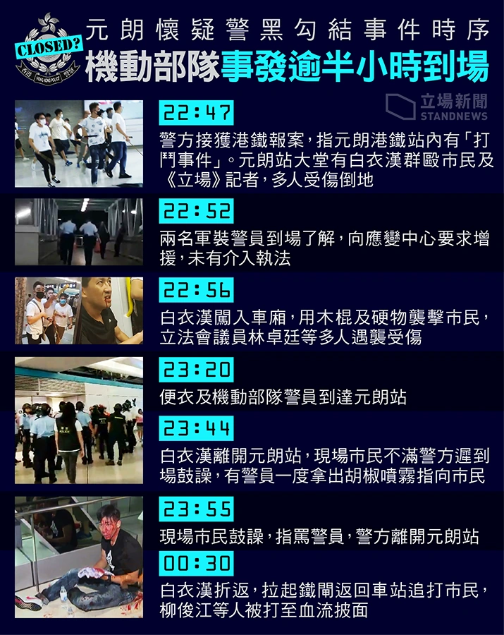元朗大批暴徙「無差別」毆打市民,警方反應奇慢引「警黑勾結」質疑 7月下旬 民陣再次發起反《逃犯條例》遊行,大會表示有43萬人參與;遊行結束後有示威人士前往中聯辦示威並塗污中華人民共和國國徽,警方隨即以催淚彈清場。 元朗有大批身穿白衣的懷疑黑社會於區內糾黨,配備木棍、藤條等追打參與遊行的市民,更湧入元朗西鐵站內登上列車見人就打,多人血流披面,有人送院。 7月18日 立法會議員張超雄計劃以私人草案修訂《逃犯條例》作單次移交,被指為香港政府「助攻」,舉網嘩然,張超雄隨後撤回有關修訂。 7月17日 美國《時代雜誌》選出全球25位最具影響力互聯網人物,反《逃犯條例》修訂示威者榜上有名。 7月16日 逾千市民不滿沙田新城市廣場日前容許警方進場圍堵反《逃犯條例》修訂遊行示威引發警民衝突,晚上包圍商場客戶服務部投訴。 檢 • 論 • 編 香港網絡大事表總表新聞動態 • 香港網絡動態列表高登大事表00年代2000 • 2001 • 2002 • 2003 • 2004 • 2005 • 2006 • 2007 • 2008 • 200910年代2010 • 2011 • 2012 • 2013 • 2014 • 2015 • 2016 • 2017 • 2018 • 201920年代2020 • 2021膠登大事表舊膠登時代2006 • 2007 • 2008 • 2009 • 2010新膠登時代2013 • 2014 • 2015 • 2016 • 2017 • 2018郊登年代2019 • 2020LIHKG大事表10年代2016 • 2017 • 2018 • 201920年代2020 • 2021網誌界大事表00年代2003 • 2004 • 2005 • 2006 • 2007 • 2008 • 200910年代2010 • 2011 • 2012 • 2013 • 2014 • 2015 • 2016 • 2017 • 2018Facebook大事表2008或以前 • 2009 • 2010 • 2011 • 2012 • 2013 • 2014 • 2015 • 2016 • 2017 • 2018 • 2019Yahoo!知識+大事表2006 • 2007 • 2008 • 2009 • 2010 • 2011 • 2012 • 2013及以後 分類:模板呼叫時使用重複的參數的頁面大事表 除非另有註明,否則社區內容均使用CC-BY-SA授權條款。