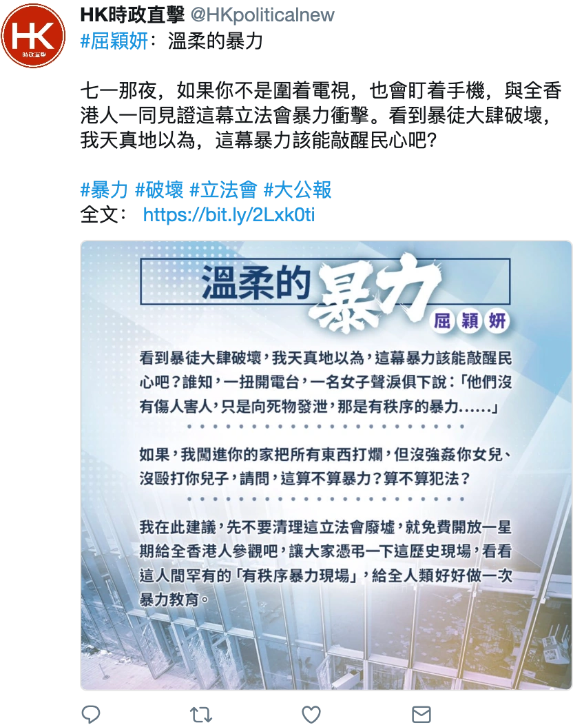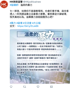 Twitter移除及暫停20萬個疑與中國政府有關的帳號,當中有帳號曾分享屈穎妍的文章 8月下旬 針對警方幾近失控的粗暴鎮壓及黑社會攻擊市民,民陣發起流水式集會,並稱有至少170萬人出席,當日亦為近來首度未有以催淚彈清場。 元朗襲擊事件發生一個月,元朗西鐵站數百市民靜坐抗議,惟及後再現警民對峙,最終大部分示威者乘港鐵離開。 8月22日 《環球時報》報道失蹤英國駐港總領事館港人職員鄭文傑因嫖妓而遭行政拘留,網民稱此事足證反《逃犯條例》修訂者的憂慮。 8月21日 中國外交部發言人報稱失蹤英國駐港總領事館港人職員鄭文傑違反《治安管理處罰法》,遭處行政拘留15天。 8月20日 一中年男子於將軍澳景林邨連接厚德邨的行人隧道連儂牆向三名男女持刀施襲,其中一名女子受重傷,網民關注傷者情況及警方事後疑再度失職。 民主黨立法會議員林卓廷揭露警方於6月下旬在北區醫院向一名疑干犯襲警的老翁行私刑,網民嘩然。 兩大社交平台Facebook及Twitter分別發表聲明,指已移除及暫停大量涉故意就香港現況散播假訊息與誤導性輿論的帳戶,並表示相信這些帳戶與中國政府有關。 8月18日 民陣流水式集會前,警方因以電話短訊形式請市民各媒體的最新消息,以及警方社交媒體更新,網民熱議。 8月16日 香港首富李嘉誠首度就《逃犯條例》修訂風波開腔,於本港主要報章刊登廣告,網民熱議箇中玄機。 檢 • 論 • 編 香港網絡大事表總表新聞動態 • 香港網絡動態列表高登大事表00年代2000 • 2001 • 2002 • 2003 • 2004 • 2005 • 2006 • 2007 • 2008 • 200910年代2010 • 2011 • 2012 • 2013 • 2014 • 2015 • 2016 • 2017 • 2018 • 201920年代2020 • 2021膠登大事表舊膠登時代2006 • 2007 • 2008 • 2009 • 2010新膠登時代2013 • 2014 • 2015 • 2016 • 2017 • 2018郊登年代2019 • 2020LIHKG大事表10年代2016 • 2017 • 2018 • 201920年代2020 • 2021網誌界大事表00年代2003 • 2004 • 2005 • 2006 • 2007 • 2008 • 200910年代2010 • 2011 • 2012 • 2013 • 2014 • 2015 • 2016 • 2017 • 2018Facebook大事表2008或以前 • 2009 • 2010 • 2011 • 2012 • 2013 • 2014 • 2015 • 2016 • 2017 • 2018 • 2019Yahoo!知識+大事表2006 • 2007 • 2008 • 2009 • 2010 • 2011 • 2012 • 2013及以後 分類:模板呼叫時使用重複的參數的頁面大事表 除非另有註明,否則社區內容均使用CC-BY-SA授權條款。