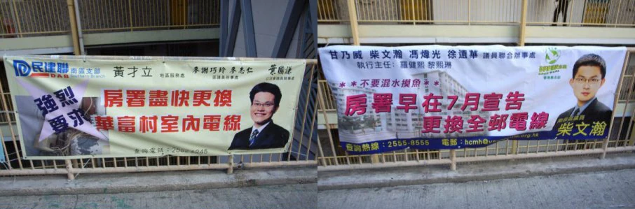 民建聯南部支部在2009年11月於港島南區華富邨,掛出橫額「要求」房署更換日漸老化的華富邨全邨的電線,瞬即同邨另一選區的民主黨議員掛出橫額,說明房署早在7月已承諾更換全邨電線,並要求民建聯不要混水摸魚欺騙市民,結果引起一眾網民恥笑。[4]
