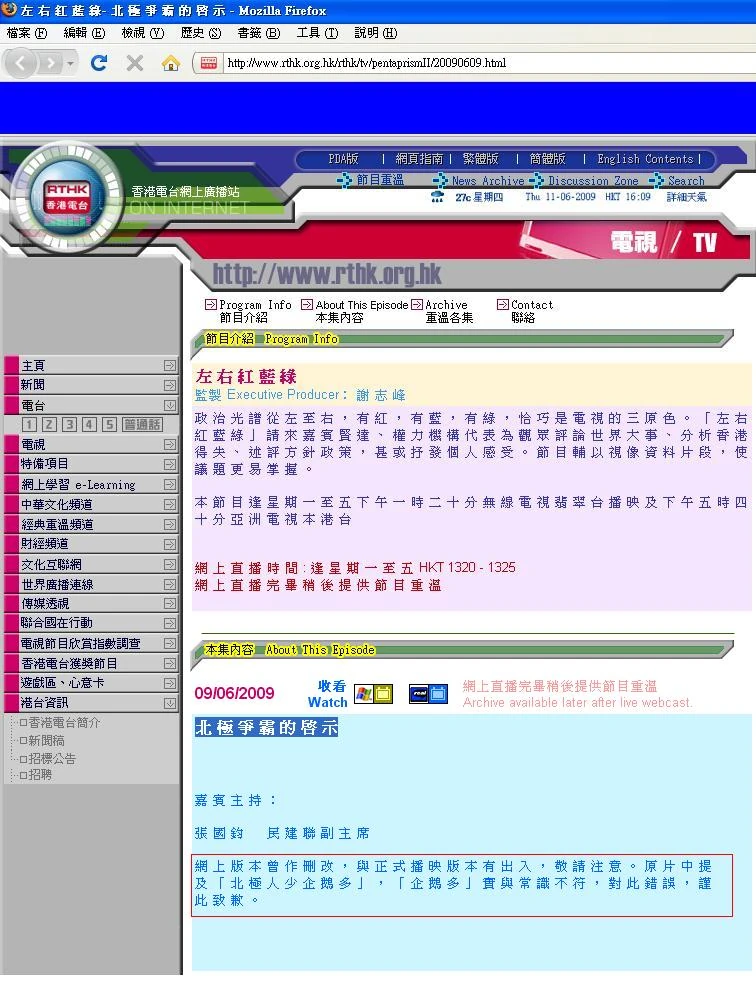 - ↑ YouTube影片:民建聯成功爭取北極有企鵝 @ 左右紅藍綠 2009-06-09