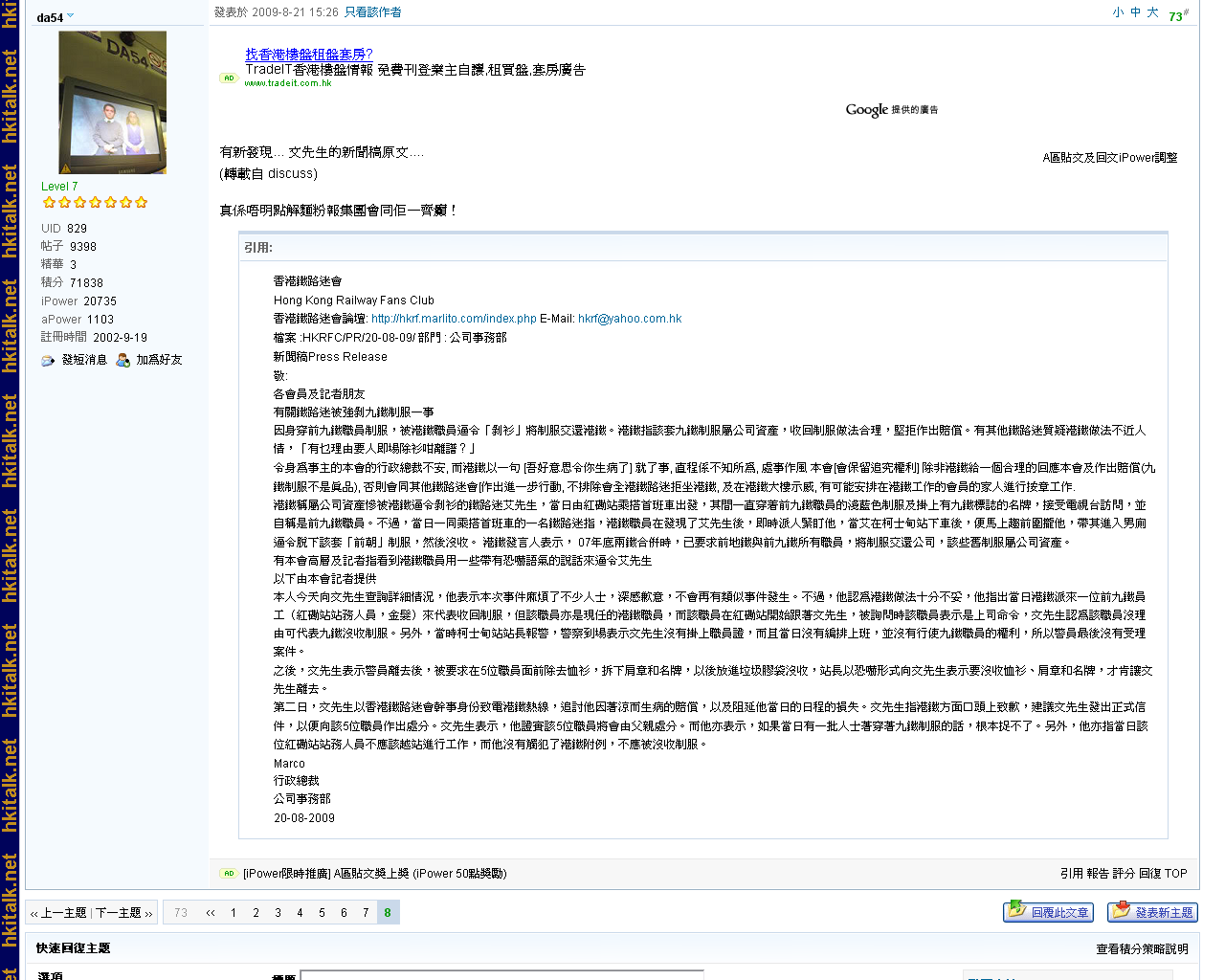 | 「 | 香港鐵路迷會論壇: [L]http://hkrf.marlito.com/index.php E-Mail: hkrf@yahoo.com.hk 檔案 :HKRFC/PR/20-08-09/ 部門 : 公司事務部 新聞稿Press Release 敬: 各會員及記者朋友 有關鐵路迷被強剝九鐵制服一事 因身穿前九鐵職員制服,被港鐵職員逼令「剝衫」將制服交還港鐵。港鐵指該套九鐵制服屬公司資產,收回制服做法合理,堅拒作出賠償。有其他鐵路迷質疑港鐵做法不近人情,「有乜理由要人即場除衫咁離譜?」 令身為事主的本會的行政總裁不安, 而港鐵以一句 [吾好意思令你生病了] 就了事, 直程係不知所為, 處事作風 本會[會保留追究權利] 除非港鐵給一個合理的回應本會及作出賠償(九鐵制服不是眞品), 否則會同其他鐵路迷會[作出進一步行動, 不排除會全港鐵路迷拒坐港鐵, 及在港鐵大樓示威, 有可能安排在港鐵工作的會員的家人進行按章工作. 港鐵稱屬公司資產慘被港鐵逼令剝衫的鐵路迷艾先生,當日由紅磡站乘搭首班車出發,其間一直穿着前九鐵職員的淺藍色制服及掛上有九鐵標誌的名牌,接受電視台訪問,並自稱是前九鐵職員。不過,當日一同乘搭首班車的一名鐵路迷指,港鐵職員在發現了艾先生後,即時派人緊盯他,當艾在柯士甸站下車後,便馬上趨前圍攏他,帶其進入男廁逼令脫下該套「前朝」制服,然後沒收。 港鐵發言人表示, 07年底兩鐵合併時,已要求前地鐵與前九鐵所有職員,將制服交還公司,該些舊制服屬公司資產。 有本會高層及記者指看到港鐵職員用一些帶有恐嚇語氣的說話來逼令艾先生。 以下由本會記者提供 本人今天向文先生查詢詳細情況,他表示本次事件麻煩了不少人士,深感歉意,不會再有類似事件發生。不過,他認為港鐵做法十分不妥,他指出當日港鐵派來一位前九鐵員工(紅磡站站務人員,金髮)來代表收回制服,但該職員亦是現任的港鐵職員,而該職員在紅磡站開始跟著文先生,被詢問時該職員表示是上司命令,文先生認為該職員沒理由可代表九鐵沒收制服。另外,當時柯士甸站站長報警,警察到場表示文先生沒有掛上職員證,而且當日沒有編排上班,並沒有行使九鐵職員的權利,所以警員最後沒有受理案件。 之後,文先生表示警員離去後,被要求在5位職員面前除去恤衫,拆下肩章和名牌,以後放進垃圾膠袋沒收,站長以恐嚇形式向文先生表示要沒收恤衫、肩章和名牌,才肯讓文先生離去。 第二日,文先生以香港鐵路迷會幹事身份致電港鐵熱線,追討他因著涼而生病的賠償,以及阻延他當日的日程的損失。文先生指港鐵方面口頭上致歉,建議文先生發出正式信件,以便向該5位職員作出處分。文先生表示,他證實該5位職員將會由父親處分。而他亦表示,如果當日有一批人士著穿著九鐵制服的話,根本捉不了。另外,他亦指當日該位紅磡站站務人員不應該越站進行工作,而他沒有觸犯了港鐵附例,不應被沒收制服。 Marco 行政總裁 |