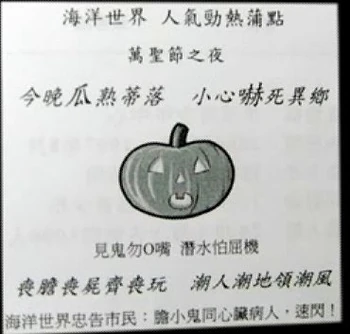 【本報訊】香城大學語文學系許伯介教授昨日發表研究報告,指出最近三年,很多香城青少年日常多使用不規範的語文,其中不少屬潮流用語和外來語,嚴重破壞中文的規範。最近三年,許教授一直追蹤五百個香城中學生的網誌,分析其所用的詞語,編製成「2007年香城中學生十大潮流用語排名榜」,並為此訪問五百名本地三十歲以上的成年人,結果,當中百分之八十五表示完全不明白這些詞語的意義。許教授說:「青少年容易受同輩影響,看見朋友在網絡中寫新奇的詞語,就一窩蜂地摹倣,以為這就是追上潮流。」本報記者昨日手持主題公園「海洋世界」的萬聖節廣告,向三十位來自中國大陸及台灣的遊客展示,他們都說不明白這個廣告的意思。