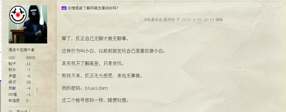 在中國一同人聯盟論壇(http://www.lv8n.com/bbs/)發怖H漫連結而被封號,事後開分身發言,聲稱管理員沒法子封鎖他。慘遭揭穿並被管理員指責後,公開自身帳號密碼並表示以後不上論壇。