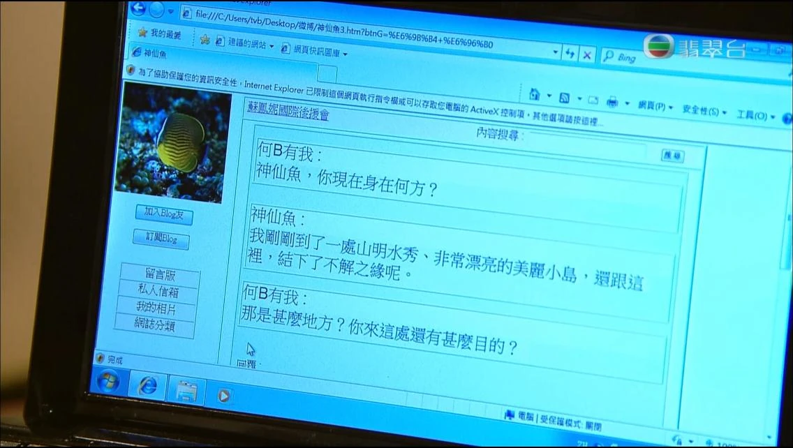 | 情越海岸線 | 姚子羚飾演的蘇鳳妮,瀏覽其網上後援會時,當中連結的網址是「file:///C:/Users/tvb/Desktop/微博/神仙魚3.htm?btnG=%E6%9B%B4+%E6%96%B0」。 |