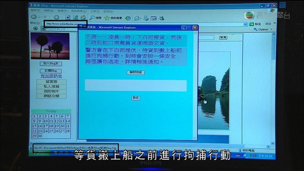 | 潛行狙擊 | 於《潛行狙擊》中的有關情節,瀏覽器當中的狀態列為「file:///C:/Documents%20and%20Settings/DELL/桌面/blog/旅遊BLOG.HTM」和「我的電腦」,網址列為一個無效的網址「www.jodie@jodie.com」。 |