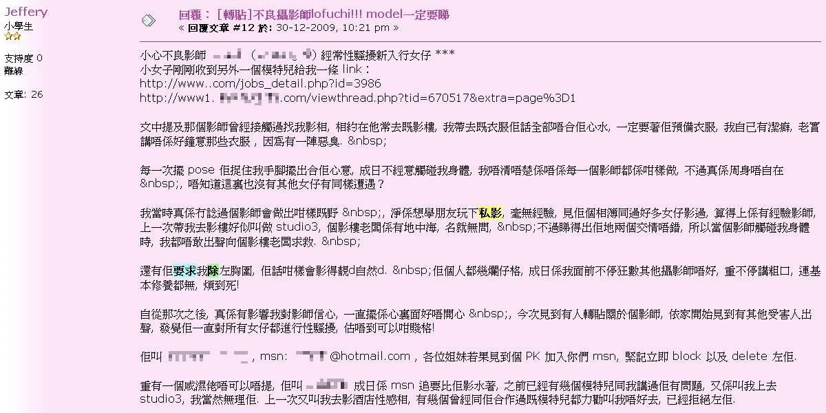 - ↑ 高登討論區:[一念之間] 《影.後》--- 互聯網文化與性侵犯,2010年11月24日。