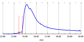 積遜去世後,各大搜索引擎由於歌迷搜索量劇增,谷歌近乎癱瘓,圖為2009年6月25日谷歌美國的「Michael Jackson」搜索量統計