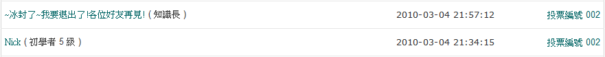 雖然被同一個子戶Nick搶答,但veteran比Matisse險得多,因為veteran到凌晨(2010-03-05 00:47:56)才發現自己被狙擊,而當時的票數是8:28,已經被Nick超前了20票。