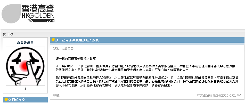 - ↑ 高登討論區 - 高登Admin的blog:請一起向菲律賓遇難港人致哀,2010年8月24日。