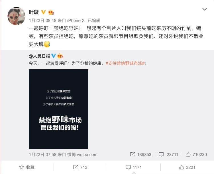 葉璇2020年1月,在新浪微博,自爆以前在內地拍攝,被要求的吃野味