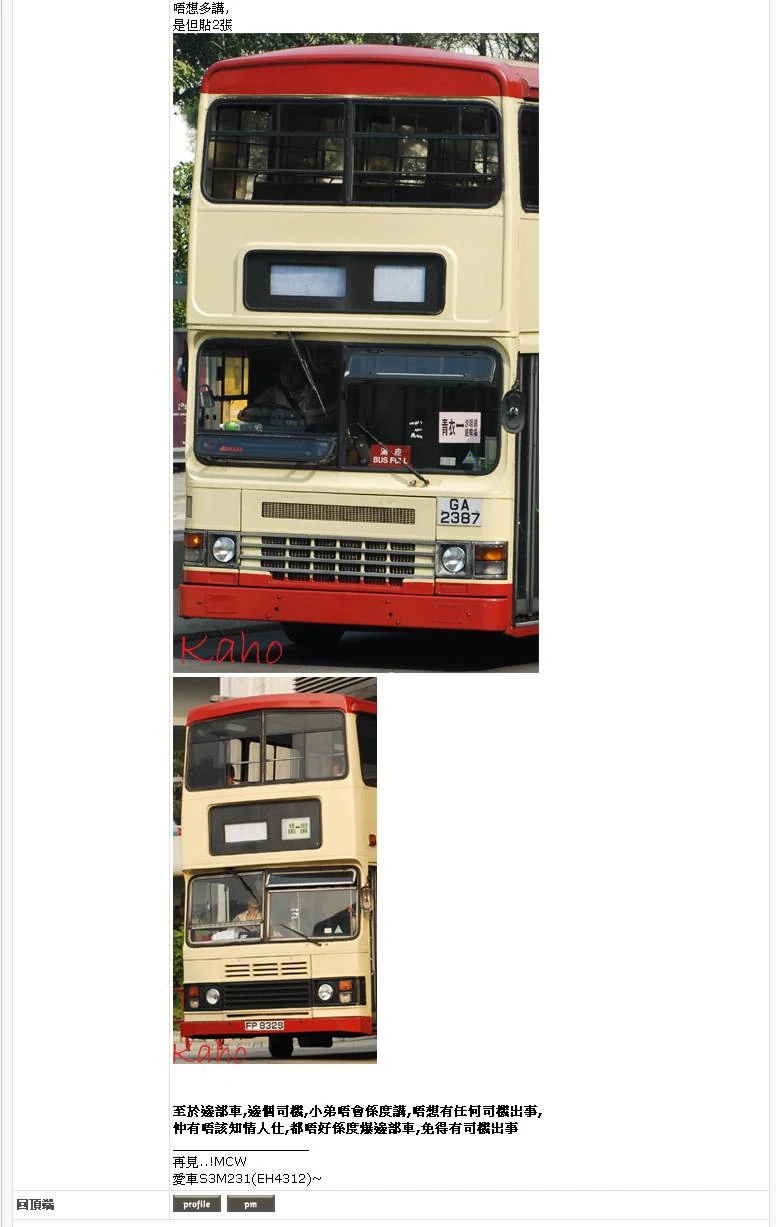都無咩野,成車巴迷....正常........ 點知行行下,覺得怪,不留一向都唔駛用名牌...點之有名牌係度.. 一睇....己經知係某幾個巴迷的傑作...."蕭巴士"英文,數字都有...... (咩D人好想燒巴士???心理變態?)..仲要有幾個係度食晒野….但聽埋落去,就會覺得好小野,因為佢地之後玩得仲勁.... 話說到達要停既地方,部車仲未停低..有巴迷竟然突然走去禁熄左engine........... 個司機即時開返........呢下我真係覺得好過份, 你地知唔知行行下突然咁做有幾危險??? 仲有下文,部車到左站後...佢地竟然問都無問下走去抆人地明愛的單張,但係經我同car-lo講之下(部車仲要行,咁客睇咩?),佢地收左手.... 收左手,但係司機落左車,佢地仲坐係部車到唔落,仲要好似部車係自己咁,係度左搞搞右搞搞.. 呢個時候,小弟忍唔到,走去問左司機一句...[你識佢地?] [唔識佢地,佢地一來就咁玩,搞到我走唔開,要睇住部車..] 小弟即走左上車怒罵佢地.....我諗當時在場的巴迷都會見到… 估都估唔到而家巴迷真係可以咁過份,人地car-lo唔出聲,唔代表可以咁玩,人地都係唔想你地唔開心,無神神話你,咁但係自己都識做,唔好做到咁過份… 唔怪得愈來愈多car-lo憎巴迷,都係多得佢地的行為... 為左自己玩,你地知唔知如果咁樣俾客睇到,一打上去,隨時有人俾炒.... 仲要真係如果我玩野,走去報警,話見到有非KMB人員走左上部無司機的巴士度,結果又會係點?(早前先有車俾人偷完)... 可能有人覺得我多事,司機都未出聲,你出聲,但係大家可以諗下..你係客,睇到會點……仲有之後,司機開左車,我影相,影完,過左站, 司機仲可以停係度問我上唔上……咁樣可以睇到當時司機係覺得我多事定係點……最後得覺得好無mood,好地地影相搞到咁,小弟同某板友係無上到車. 我希望當事人可以反省下自己的行為…諗下自己係度做緊咩,眼見有幾個大的巴迷係度,咁大個人知唔自己係度做咩?..點解會無神神俾個唔識的人走上車罵? 我希望當事人經過今次事件,唔好再有下次,唔好再亂搞部車的任何野,唔好再將你個張咁既名牌放上去….. 講到明,下次如果我一見到,我唔會再罵,我會二話不說即時報警… 至於邊部車,邊個司機,小弟唔會係度講,唔想有任何司機出事, 仲有唔該知情人仕,都唔好係度爆邊部車,免得有司機出事 |