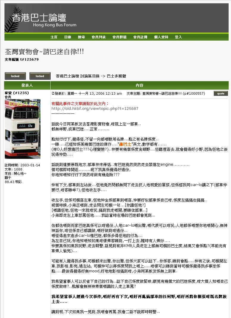怎知巴士行駛途中,我覺得有點怪:車廂內一般都沒有名牌(製造商標識)。當我一看「名牌」,已經知道是某數名巴士迷的傑作,包括有「蕭巴士」、英文、數字都有(按:是車牌號碼的典型排列,例如XX1234)。我心想:那班人很想燒巴士?抑或是心理變態?還有車廂內有數位巴士迷在違規飲食。但說下去,就是小巫見大巫:因為他們稍後玩得更勁! 話說巴士到達要停車的位置時,車未停定前,有巴士迷突然去到司機位,按了駕駛盤上「關掉引擎」的按鈕。後來司機發覺後,即時開啟引擎。我真是覺得太過份,你們這班巴士迷,不知道巴士行駛途中突然這樣做,是多麼危險! 還有下文:當巴士到站後,他們竟然問也不問一下,走去車頭企圖撕走貼在車頭的《明愛賣物會》單張,但是經我及司機勸告下,他們收了手。(該部巴士仍要載客,沒有單張,乘客看甚麼往賣物會?) 他們雖然收了手,但在司機下車後,他們仍在車廂內不肯下車,似乎要將這部巴士歸他們所有,在車廂內不斷搞作。這個時候,小弟(家豪)忍不住走去司機問一句:「你識得他們?」司機:「我不識他們,他們一來就這樣玩,害得我無法離開巴士,要看住巴士。」小弟即走上車痛罵他們一頓。我想當時在場的其他巴士迷都會見到。 我想也想不到,現在的巴士迷可以這麼過份,人家司機默不作聲,不代表他們可以放肆,人家都是不想你們不開心,六神無主批評你們;你們都要知道要檢點,不要過份。難怪越來越多巴士司機討厭巴士迷,都是拜他們的「怪行」所致。為了放肆,你們知不知道如果被其他乘客看到,向巴士公司投訴,司機飯碗不保!還有如果換了我放肆,其他乘客報警,聲稱見到有非九巴工作人員登上無司機駐守的巴士,結果又會怎樣?[2] 我希望當事人可以反省下自己的行為,想想自己在做甚麼,眼見有數位較年長的巴士迷在此,身為大人知否自己在此做甚麼?為何會六神無主般,被那些陌生人走上巴士痛罵? 我希望當事人經過今次事件,不要再有下次再犯,不要再亂搞部車的任何裝置,不要再將你們那張「名牌」放上去! 我說明一下:下次如果我見到的話,我不會再罵:我會二話不說即時報警! 至於是哪部巴士,哪位司機,小弟在此恕不公開,我不想有任何司機出事;還有請知情的人仕,勿在此宣揚是哪部巴士出事,免得有司機出事。 |