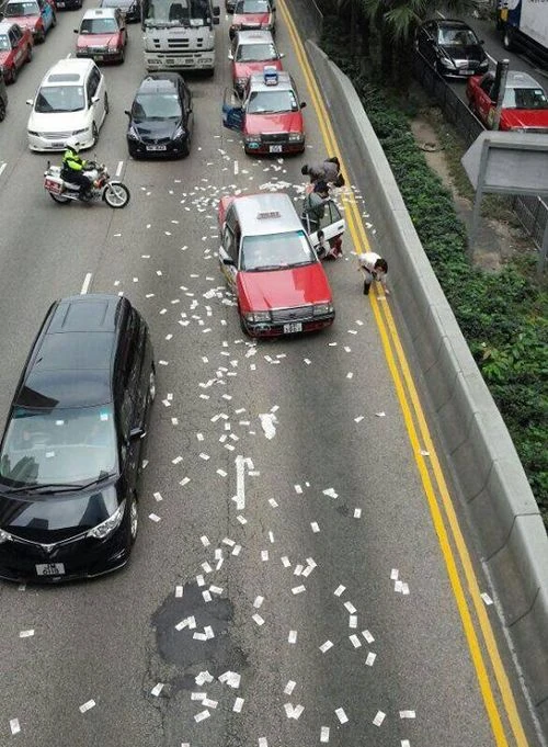 據目擊者稱,錢箱跌出馬路,大叠鈔票散滿慢線行車線並隨風飄揚,部份更吹向銅鑼灣方向,形成一條「錢路」。多輛駛經車輛的司機及乘客見狀先後停車並落車執錢,未幾又有10多名途人從行人路衝出馬路加入執錢行列,部份人為剛於灣仔用膳完畢的大陸旅行團團員。約10分鐘後,有警員駕駛電單車到場喝止搶錢行徑,惟錢箱內鈔票已幾被執清。解款公司及警方事後點算損失,證實有1,523萬元鈔票失蹤。[3][4]