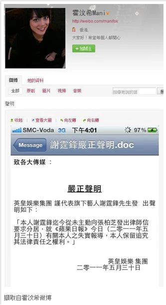 - ↑ 高登討論區:霆鋒發律師信逼柏芝分居