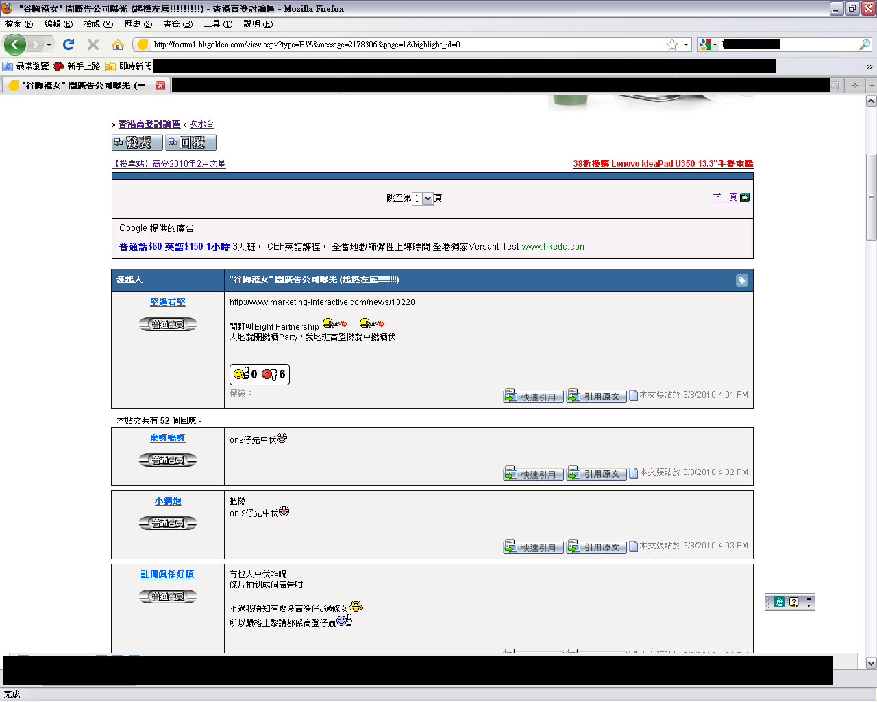 2010年3月8日,下午4時01分,高登討論區內一名新註冊的會員「堅過石堅」(會員編號: 250198)發表一篇名為「"谷胸港女" 間廣告公司曝光(起撚左底!!!!!!!!!)」的文章,轉貼該篇膳稿的連結,聲稱高登網民「中伏」,被利用,替網民不值,但迅速被網民發現此會員乃打手,張貼文章曲線為公關公司及客戶宣傳。該文章於16分鐘內迅速被高登管理員刪除。