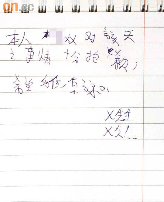 肇事男生道歉信(《東方日報》圖片)