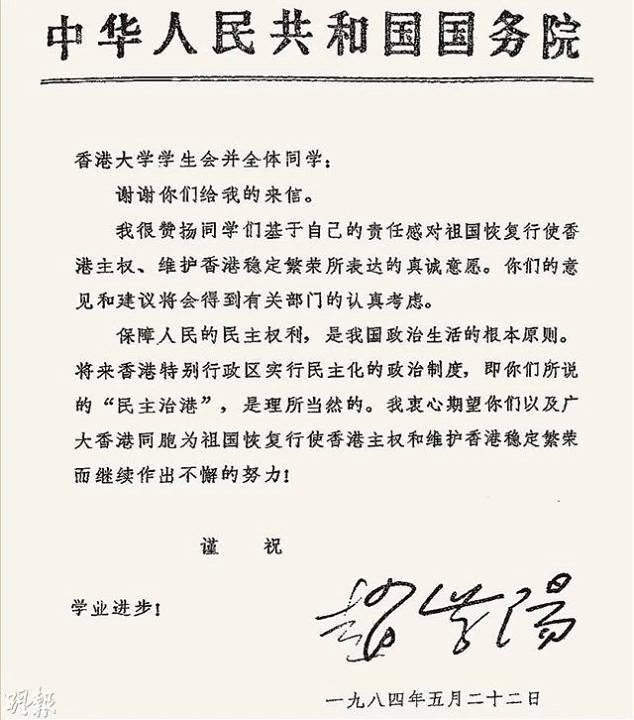 趙紫陽在1984年底以中國總理身份與時任英國首相戴卓爾夫人簽署《中英聯合聲明》,在簽署聲明前,趙紫陽曾經致函香港大學學生會,承諾將來香港回歸以後會保障民主自由。這份書信在2013年底重見天日,適逢香港社會討論普選議題,引發網民和市民的議論[3]。