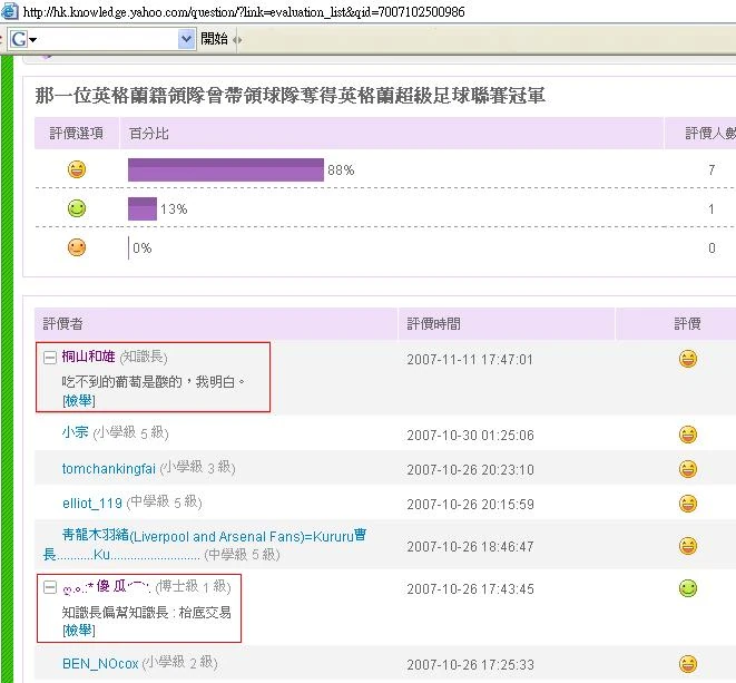 而且,ღ.。.:* 傻 瓜·´¯`·.曾多次被桐山和雄擊敗,在其中一條被桐山和雄擊敗的發問亨利最終選擇加盟巴塞隆拿,結束與阿仙奴的8年的賓主關係,你有何感受?對阿仙奴來季有什麼影響?中,發問者將桐山和雄和另一位碩士級玩家稱為Yahoo!知識+分析高手,但對ღ.。.:* 傻 瓜·´¯`·.包裝得美輪美奐的回答卻視而不見,不加任何評語。