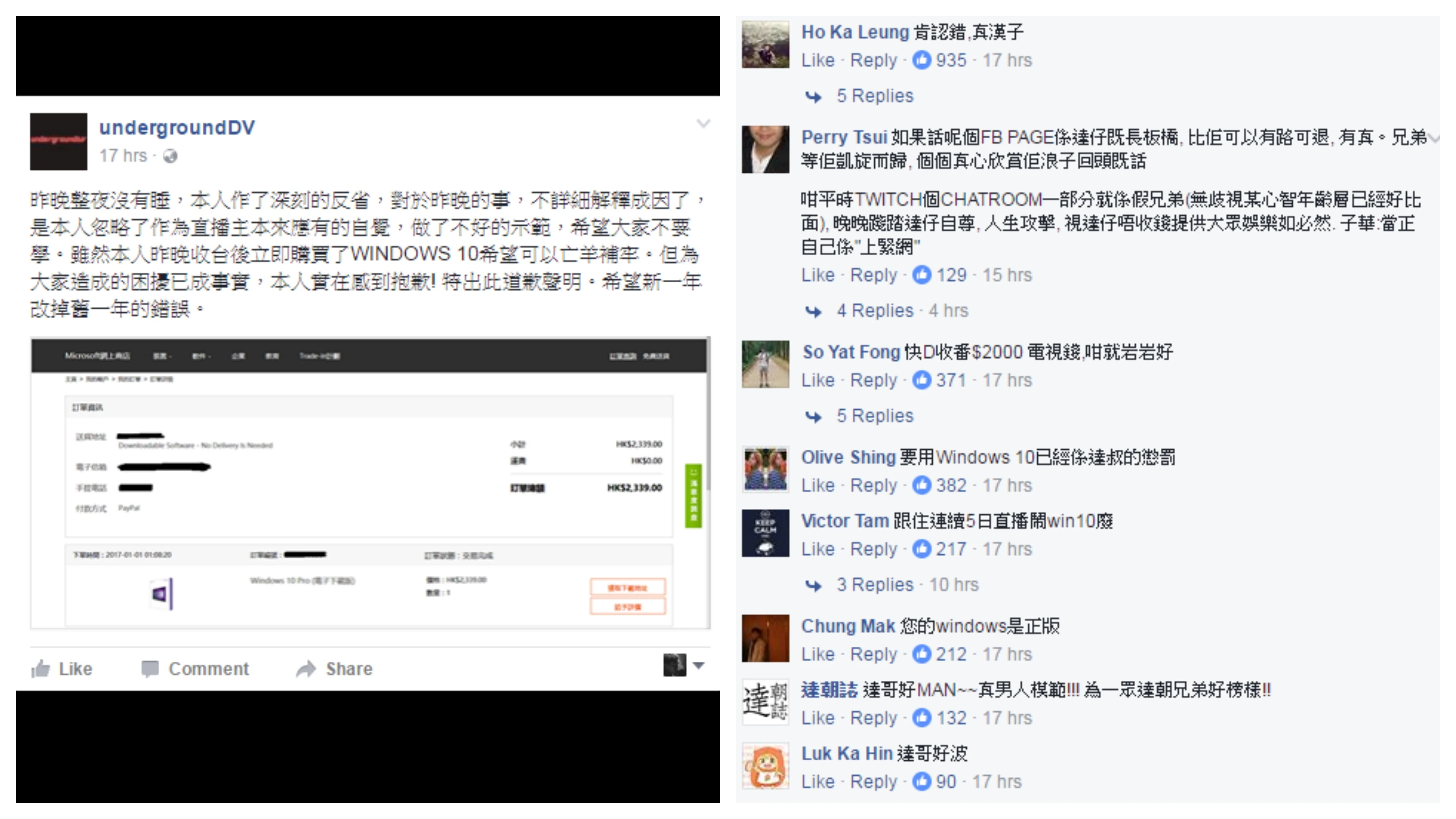 1月20日晚上,達哥在facebook開post公開事件始末。他表示早於2013年6月23日backup佬已開始上載直播片段,認為只是「fans的一番好意」,所以就「隻眼開隻眼閉」,而在一年前(2016年3月26日),有人在高登開post討論backup佬以其頻道賺錢[28],達哥亦稱當時並無留意,backup佬當時也有錄音回應,但對獲利只係一句帶過,「類似話『錢果D唔好講啦』」。
