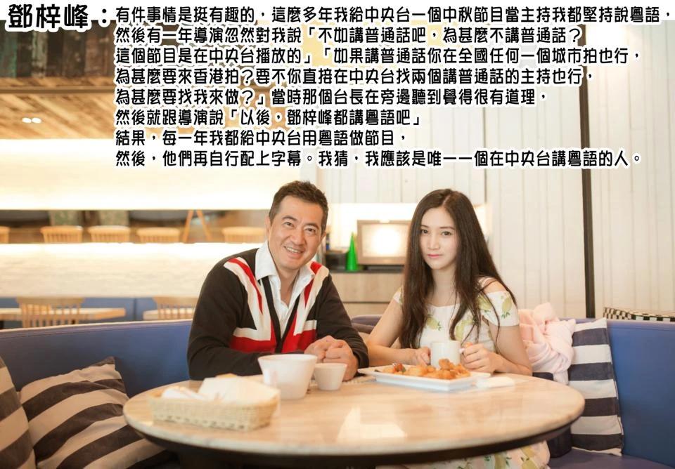 鄧梓峰:有件事情是挺有趣的,這麼多年我給中央台一個中秋節目當主持我都堅持說粵語,然後有一年導演忽然對我說「不如講普通話吧,為甚麼不講普通話?這個節目是在中央台播放的」「如果講普通話你在全國任何一個城市拍也行,為甚麼要來香港拍?要不你直接在中央台找兩個講普通話的主持也行,為甚麼要找我來做?」當時那個台長在旁邊聽到覺得很有道理,然後就跟導演說「以後,鄧梓峰都講粵語吧」結果,每一年我都給中央台用粵語做節目,然後,他們再自行配上字幕。我猜,我應該是唯一一個在中央台講粵語的人。
